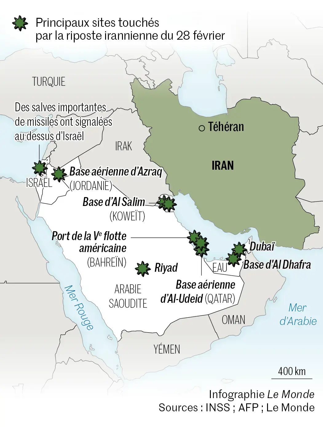 L’Iran a répliqué en visant Israël mais aussi les pays voisins abritant des bases américaines. Abou Dhabi, Koweït, Qatar, Bahreïn… Plusieurs autres pays de la région recensent des explosions sur leur territoire. L’armée israélienne a annoncé des bombardements “au cœur de Téhéran” dimanche 1er mars matin.