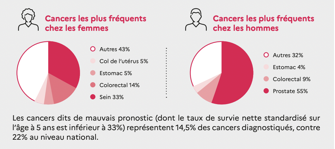 Dans sa stratégie décennale de lutte contre les cancers publiée en 2022 l’ARS Martinique explique que le cancer représente la première cause de décès avant 65 ans. Chaque année, près de 1 500 à 2 000 nouveaux cas sont diagnostiqués et environ 730 décès sont enregistrés. On estime à près de 11 000 le nombre de personnes vivant avec ou après un cancer sur le territoire. Si l’incidence globale des cancers reste inférieure à la moyenne nationale notamment chez les femmes la maladie pèse lourdement sur la population. Chez les hommes, le cancer constitue la première cause de décès, tandis qu’il se place au deuxième rang chez les femmes. La part des décès prématurés est par ailleurs plus élevée qu’au niveau de la France, en particulier chez les femmes.