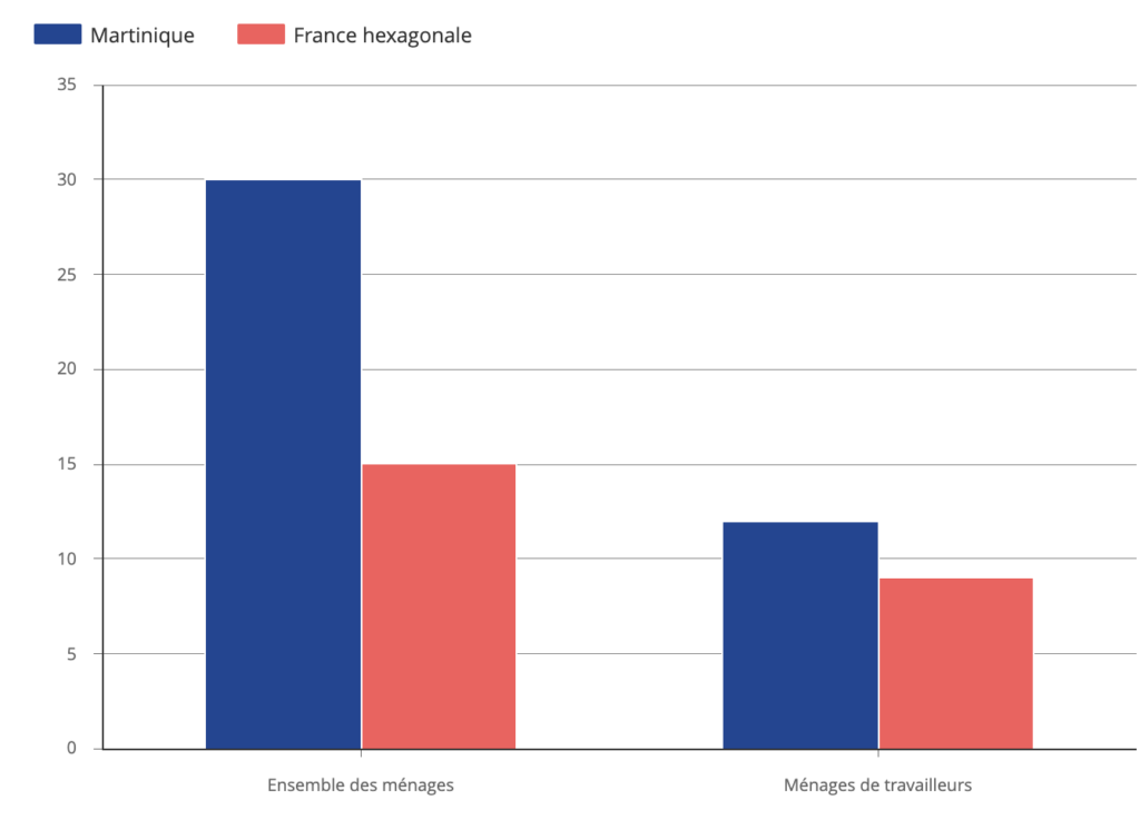 “En 2021, 12 % des ménages percevant principalement des revenus d’activité vivent sous le seuil de pauvreté, contre 30 % de l’ensemble des ménages en Martinique. Ainsi, dans la région, lorsque les revenus d’activités professionnelles constituent la source principale de revenu d’un ménage, le risque de se trouver en situation de pauvreté monétaire diminue de moitié. Le taux de pauvreté des ménages de travailleurs en Martinique se rapproche de celui observé en Hexagone, tandis que l’écart reste beaucoup plus grand pour l’ensemble des ménages.
