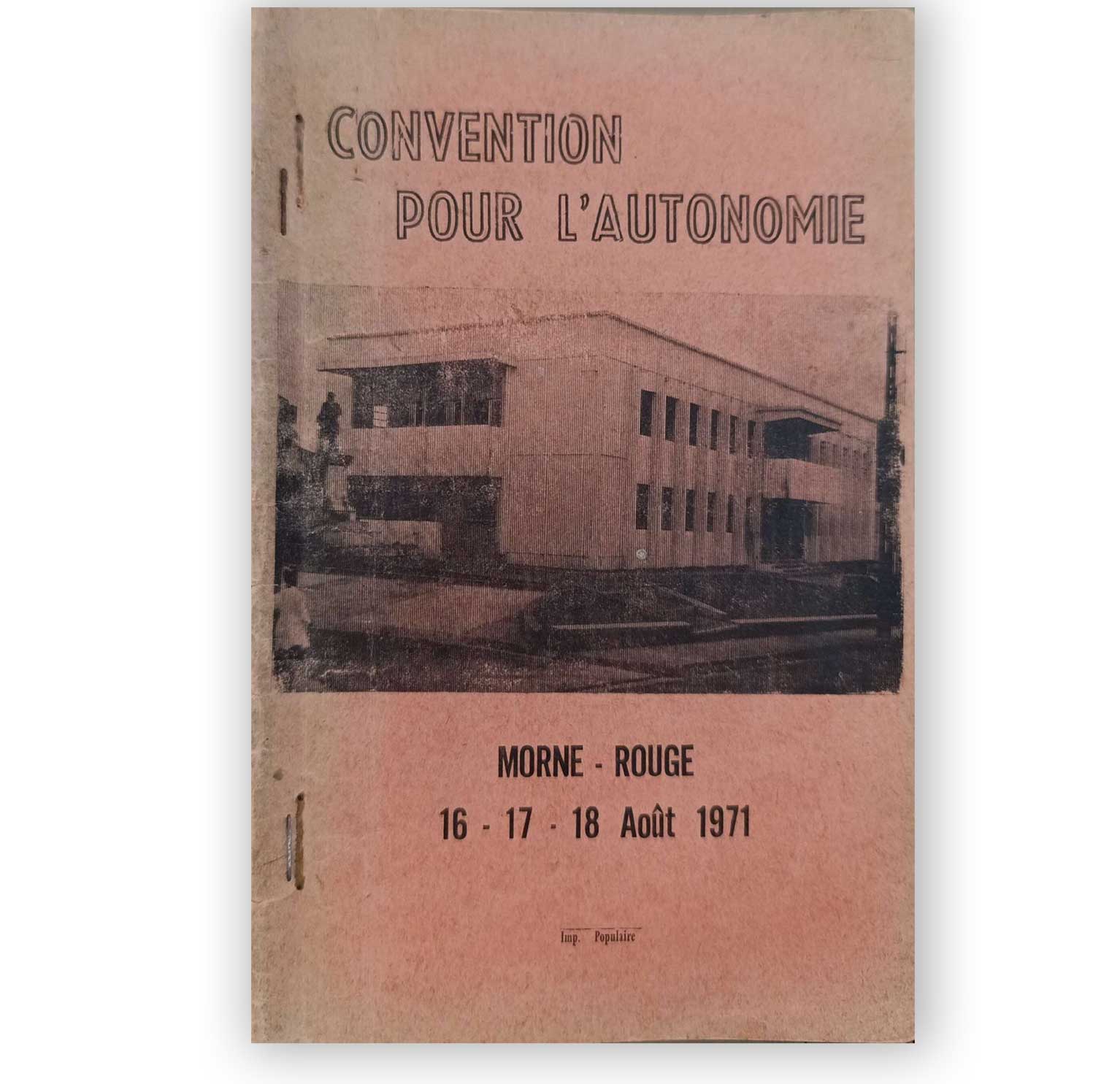 La brochure reproduit la déclaration finale / charte adoptée lors de la Convention pour l’autonomie tenue au Morne‑Rouge (Martinique) du 16 au 18 août 1971, où se réunissent partis et organisations anticolonialistes des quatre DOM (Réunion, Guyane, Guadeloupe, Martinique).
